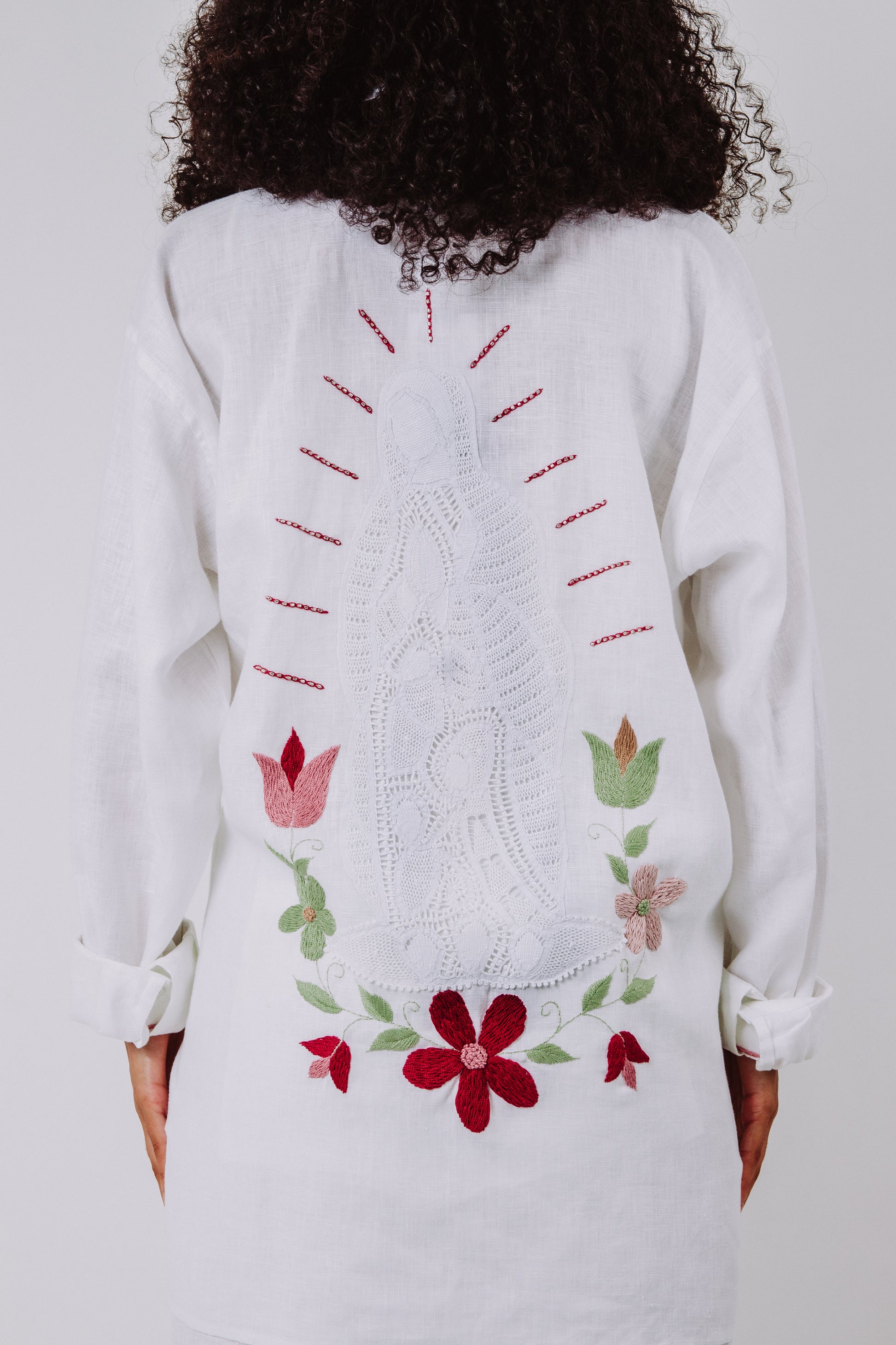 Blusa de linho 100% algodão, bordada à mão com Nossa Senhora de Guadalupe em renda Renascença
